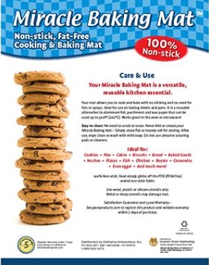 The Miracle Baking Mat allows you to cook and bake with no sticking and no need for fats or sprays. Ideal for use on baking sheets and pans. It is a reusable alternative to aluminum foil, parchment and wax paper that can be used up to 500°F(260°C). Works great in the oven or microwave!