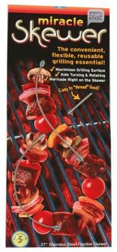 The flexible stainless steel cable works like a needle and thread; simply slide food onto the skewer, place on grill and drape the ends over the edge. Ends stay cool to the touch, making for easy turning and more evenly grilled results. Prior to grilling, marinating your food is a snap! Simply skewer meats and vegetables then place the flexible skewer within a marinating bag. The Miracle Skewer is made with 100% stainless steel; it is dishwasher safe, extremely durable and will not rust. The Miracle Skewer is ideal for kabobs, beef and chicken, shrimp and seafood, vegetables of all kinds, even grilling of foods, easy marinating right on the skewer, cool touch turning of food and much more!